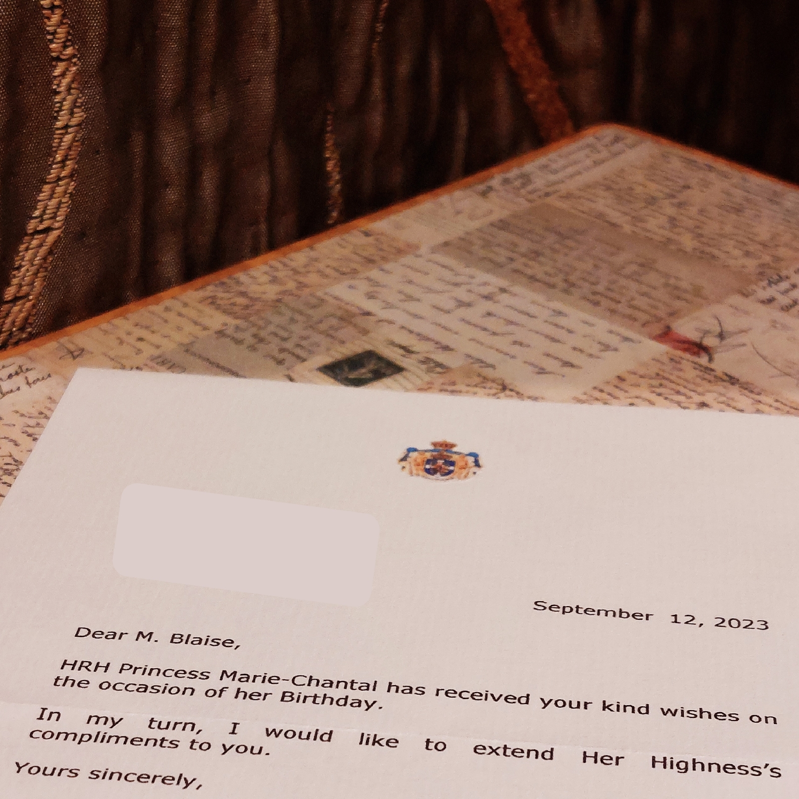 Birthday Reply from HRH Princess Marie-Chantal of Greece Posted on 20.10.23 Get link Facebook X Pinterest Email Other Apps Received Birthday Reply from HRH Princess Marie-Chantal of Greece 🇬🇷 Sent on 15 August 2023Received on 18 Oct 2023My very first response from the Greek Royal Family! I love the beautiful stamp so much!! Thank you Your Royal Highness! :)) Comments